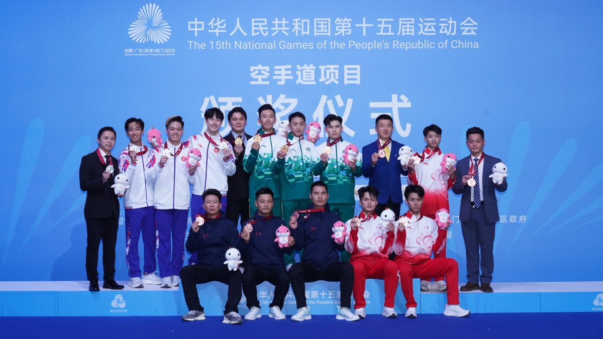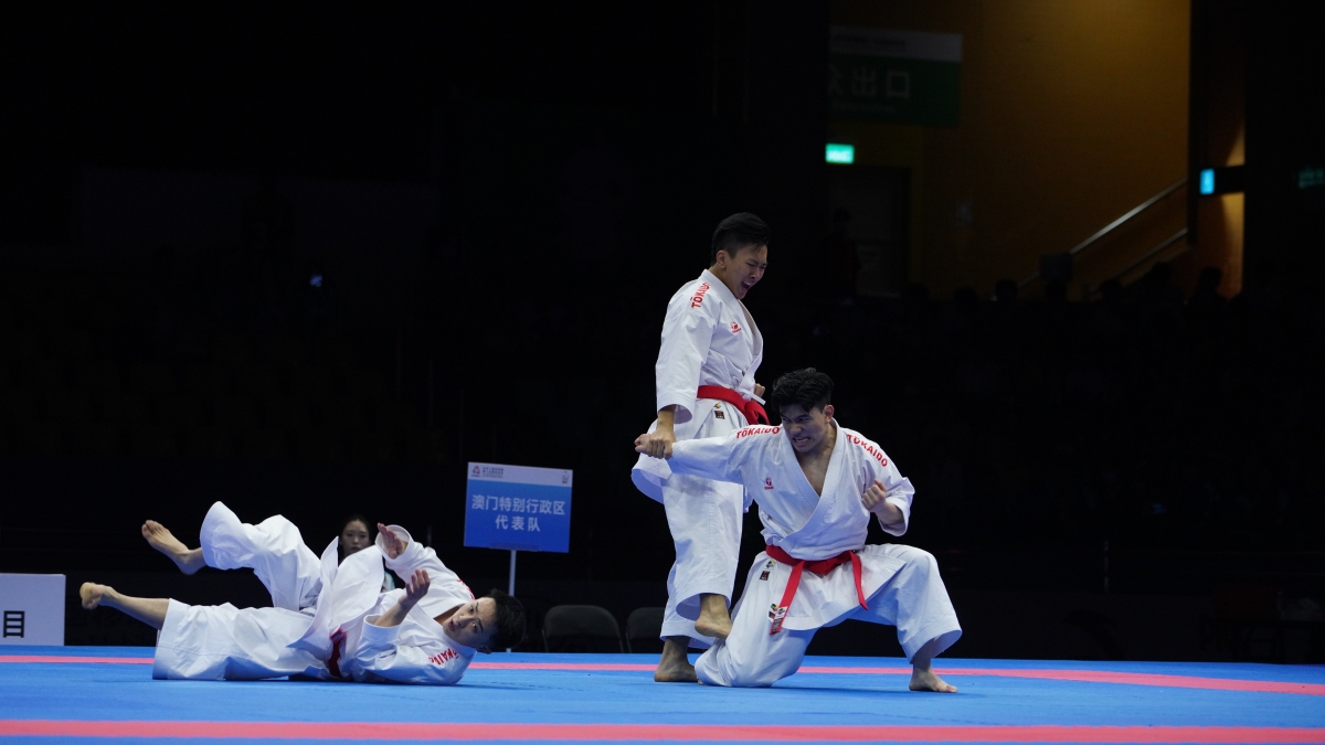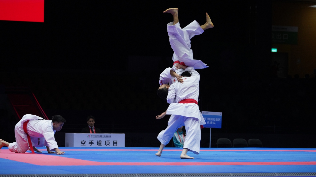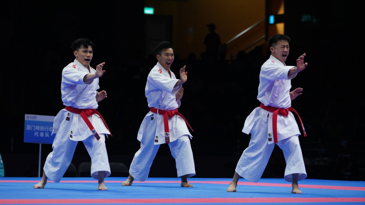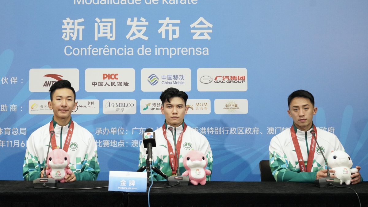 【點新聞報道】在第十五屆全運會空手道比賽男子業餘組團體型的項目今日(6日)舉行,由澳門運動員郭建恆、方文浩及鄭沘珞組成的澳門隊伍勇奪金牌,創下歷史佳績。賽後三位運動員分享感受時表示很開心能在澳門主場奪得獎牌,面對主場作戰的壓力,難免心情緊張,但觀眾的熱情支持成為最大動力,三位運動員特別感謝現場觀眾、志願者、工作人員,以及市民支持。