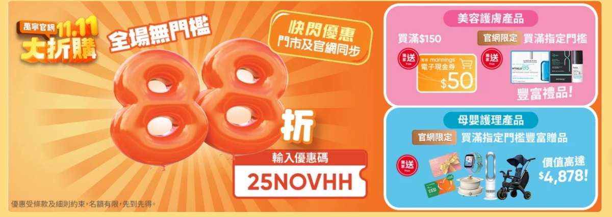 11月7日萬寧感謝祭,今日到萬寧門市或於官網購物,即享全場無門檻88折。而家入手任何護膚產品買滿$150,更即送$50萬寧現金優惠券。