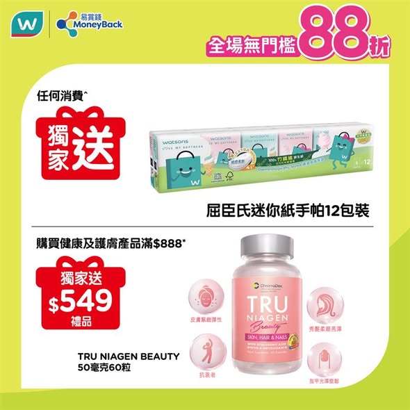 同時,還有一日限定豐富禮品,任何消費獨家送屈臣氏迷你紙手帕12包裝;買健康、護膚或美妝產品滿$888,送TRU NIAGEN樂加欣BEAUTY 50毫克60粒(價值$549)。
