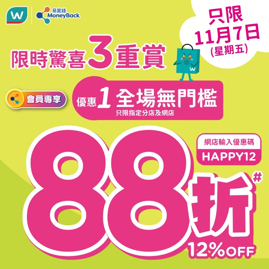 屈臣氏今日推出易賞錢會員限時驚喜3重賞,門市及網店全場無門檻88折(網店優惠碼「HAPPY12」);買任何護膚/美妝產品滿$150(不包括男士護膚產品)送$50護膚/美妝產品優惠券,用AlipayHK單一簽賬滿$200即減$20。