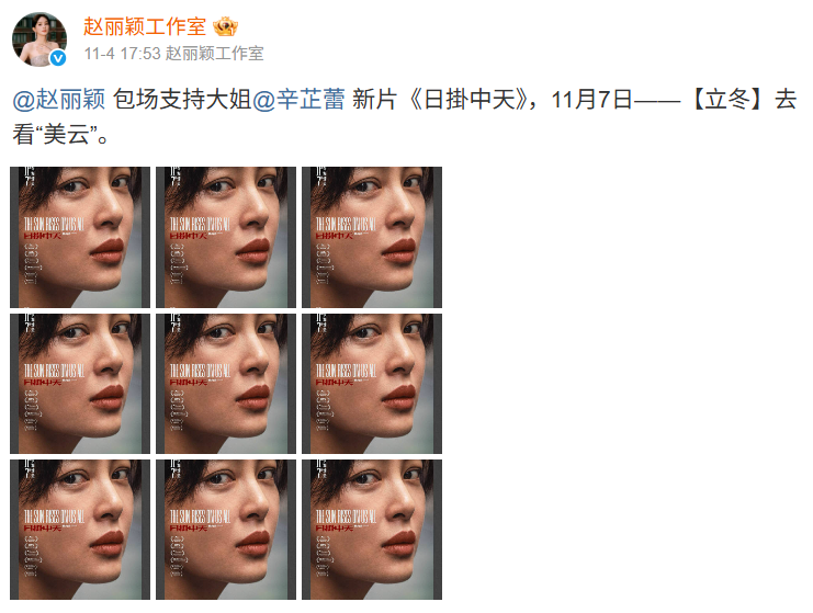 內地女星趙麗穎的工作室近日在微博發文:「包場支持大姐(辛芷蕾)新片《日掛中天》。」並呼籲影迷11月7日(立冬)觀影,呼應辛芷蕾片中角色「美雲」。隨後,「趙麗穎連包10場支持辛芷蕾新片」衝上熱搜。