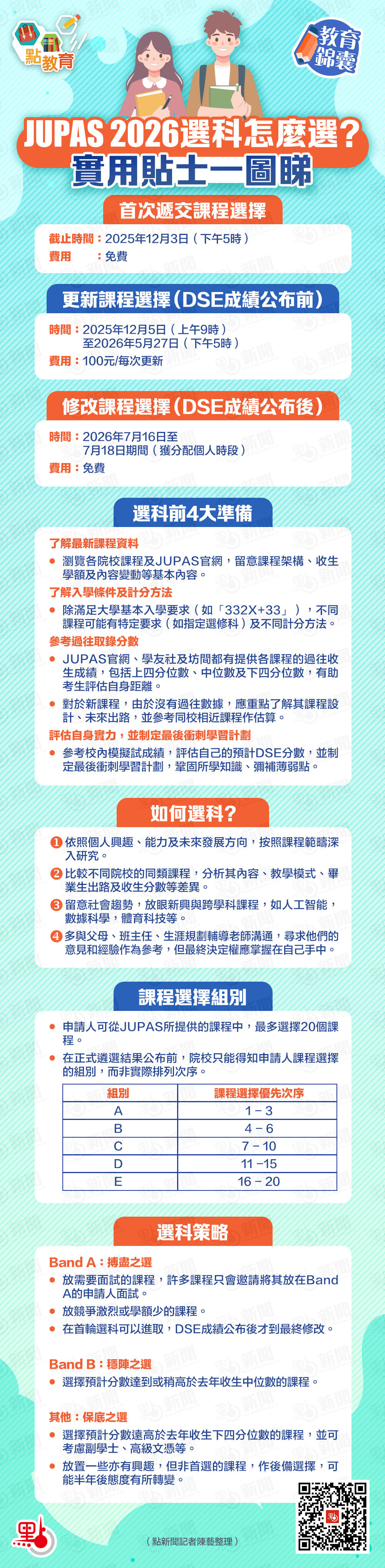 【點新聞報道】2026年大學聯招(JUPAS)申請已經展開,各位DSE考生需要在12月3日下午5時前遞交申請及課程選擇。想在升學路上穩操勝券?首次選科的部署至關重要。這份懶人包為各位考生及家長整合選科關鍵信息,助你提高入讀心儀課程的機會!
