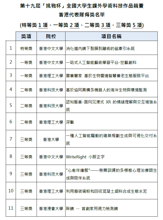 【點新聞報道】被譽為「中國大學生科技奧林匹克盛會」的第十九屆「挑戰盃」全國大學生課外學術科技作品競賽——全國總決賽,日前於南京大學圓滿舉行。由本港5所大專院校組成的香港代表隊,在與全國頂尖學生的激烈競爭中脫穎而出,共斬獲11個獎項,包括1項特等獎、2項一等獎、3項二等獎及5項三等獎,成績斐然。其中,香港中文大學更獲大賽頒發「優勝盃」,為港爭光。