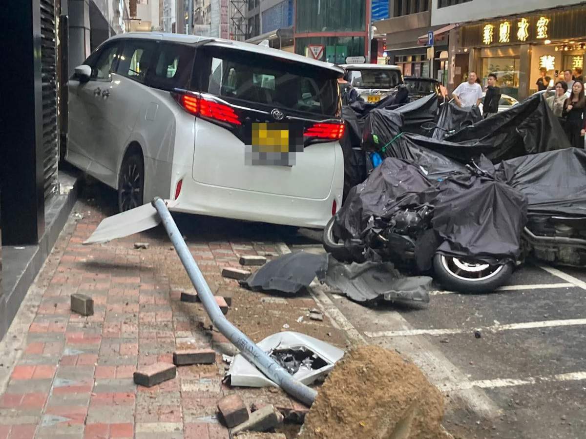 【點新聞報道】灣仔發生交通意外。事發今日(7日)下午約4時,一輛掛兩地車牌的白色七人車由史釗域道轉入謝斐道後突告失控,先撞及停泊右邊路旁的兩輛私家車,再向左撞開停泊路旁「骨位」的7輛電單車,剷上行人路猛撼大廈一間地舖汽車陳列室外牆才停下,車頭嚴重毀爛。據悉,肇事司機受傷,口部流血及身體抽搐,送院時清醒,警方正對意外原因展開調查。