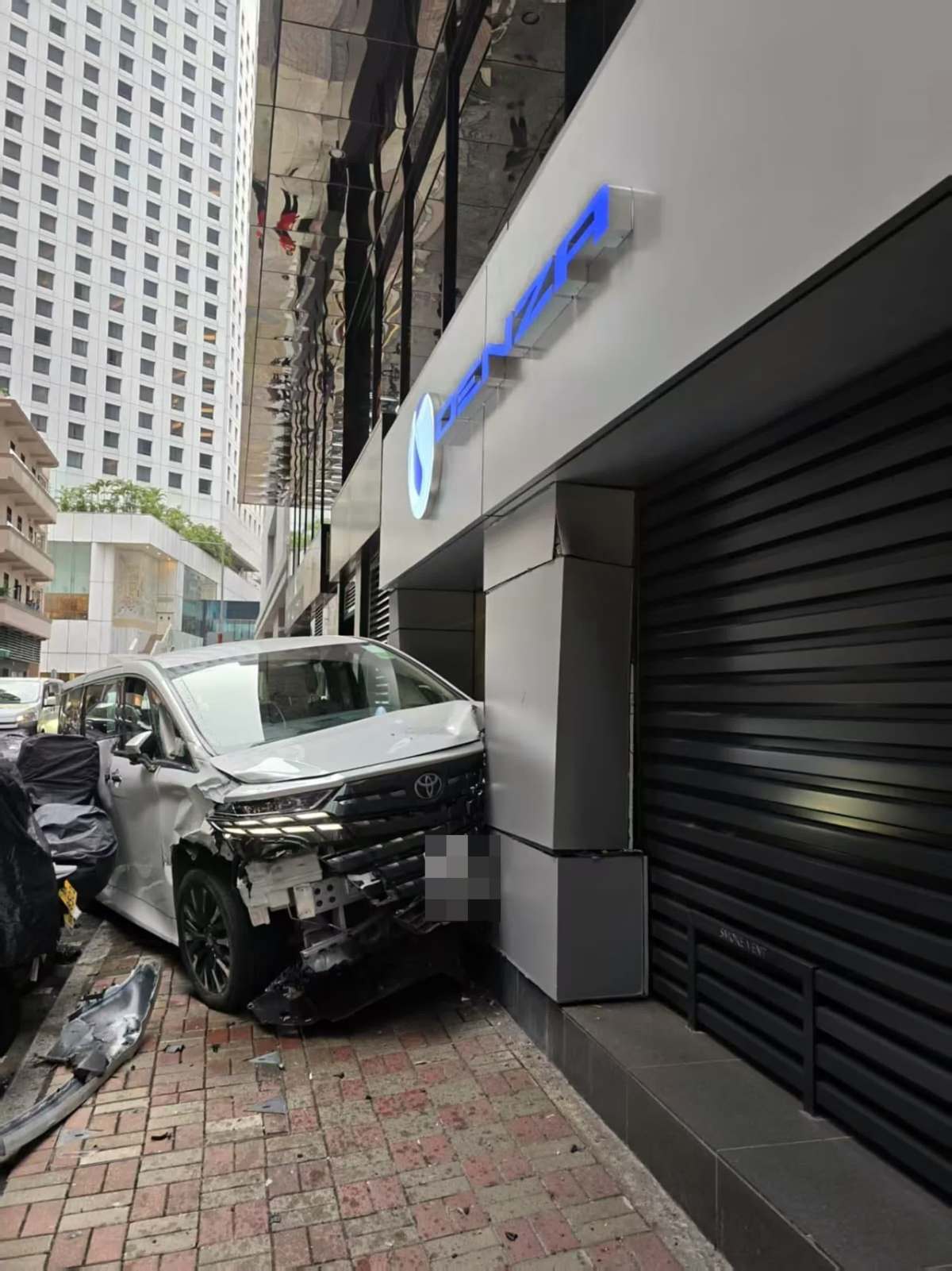 由現場照片可見,涉事七人車撞牆後,斜擱在行人路上,泵把飛脫、右邊車頭損毀。現場一個路牌被撞至連根拔起,另外被撞的電單車東倒西歪。