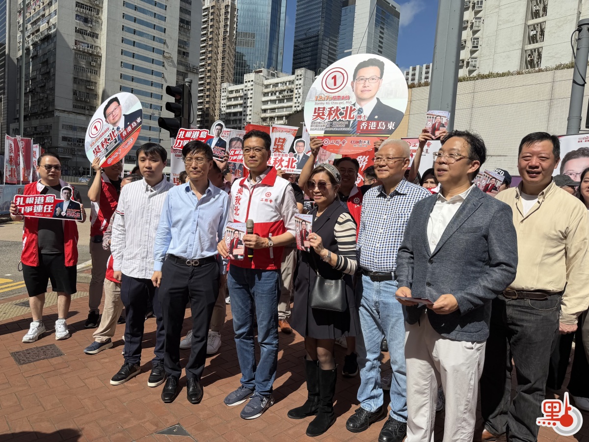 【點新聞報道】隨着新一屆立法會選舉提名期結束,各參選人正密鑼緊鼓地開展宣傳活動,多個地方選區競爭激烈。其中,港島東地方選區參選人有吳秋北、李清霞、郭浩景、植潔鈴及阮建中,出現「5爭2」的激烈角逐,需要比拚各位參選人的催票、組織和宣傳能力。今日(8日),港島東地方選區5位參選人紛紛在太古康山道擺街站造勢,聲勢浩大。他們聯同義工團隊,向市民展示自己的政綱理念,與街坊交流、闡釋政綱,力爭選民支持。