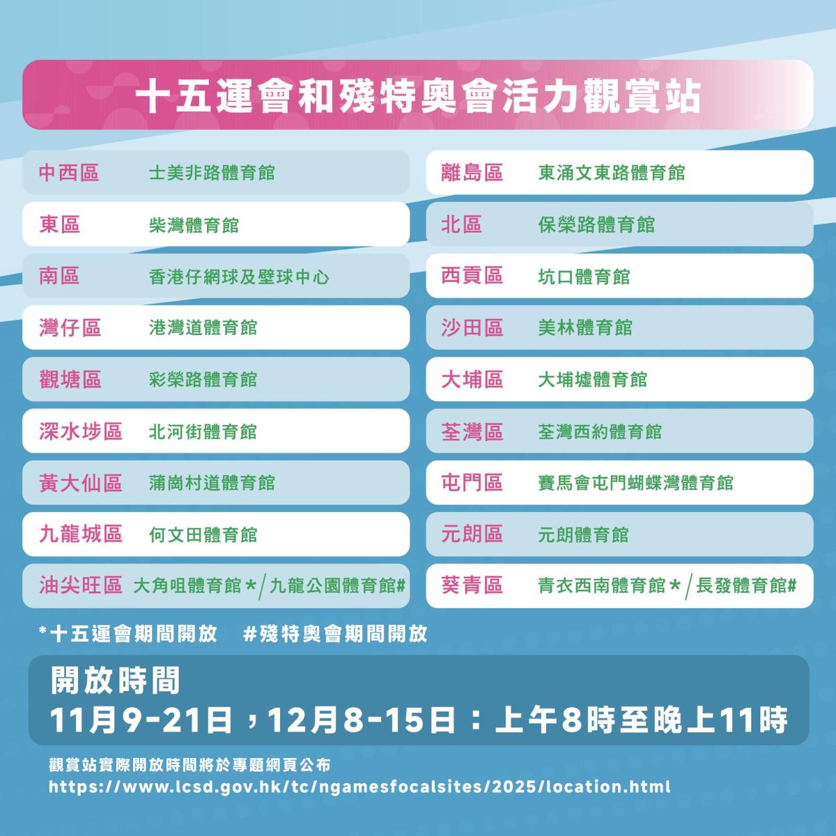 除電視直播外,全港多個商場亦設有免費賽事直播,包括:奧海城、屯門市廣場、荃新天地、朗壹廣場、apm、東港城、上水廣場、北角匯、將軍澳中心、Mikiki、PopWalk天晉匯、卓爾廣場、錦薈坊、荃錦中心、新領域廣場等。市民亦可前往康文署轄下體育館觀看直播。