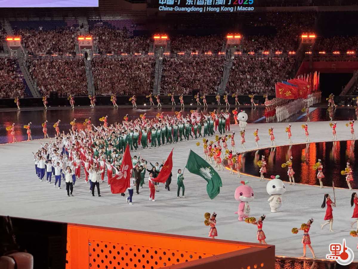 【點新聞報道】9日晚,第十五屆全國運動會開幕式在廣東奧體中心盛大啟幕。入場儀式尾聲,本屆全運會東道主粵港澳運動員方陣以「三合一」形式壓軸登場,這是全運會歷史上首次出現粵港澳三地同步入場的珍貴場景,瞬間將全場熱情推向頂點。體育場上空,《我和我的祖國》的悠揚旋律緩緩流淌,熟悉的曲調穿透場館、直抵人心,全場觀眾不約而同起身站立,雷鳴般的掌聲與深情的合唱聲交織回蕩,跨越地域的凝聚力與熾熱的家國情懷,讓整個場館熱血沸騰、震撼人心。成為當晚鐫刻在全國觀眾心中最難忘的瞬間。