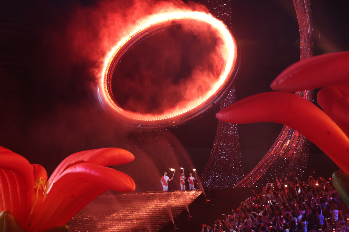 粵港澳三地火炬手共同點燃十五運會主火炬。(人民日報圖片)