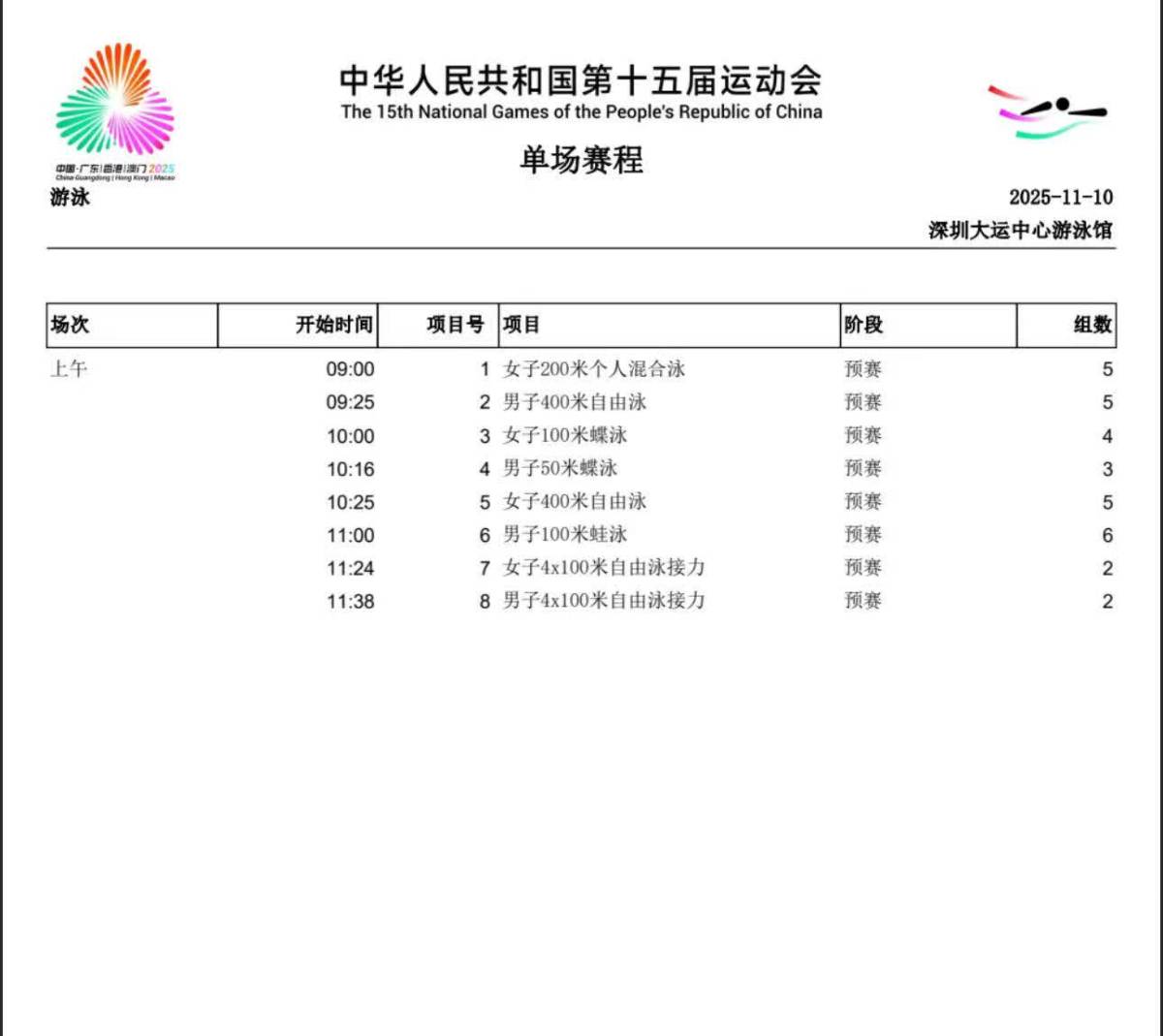 【點新聞報道】11月10日,第十五屆全國運動會游泳賽事開啟第一個比賽日。首日將進行男子400米自由泳、女子100米蝶泳、男子100米蛙泳等多個熱門項目的預賽,國家隊游泳名將潘展樂、汪順、覃海洋、孫楊、張雨霏、余依婷等將出戰。