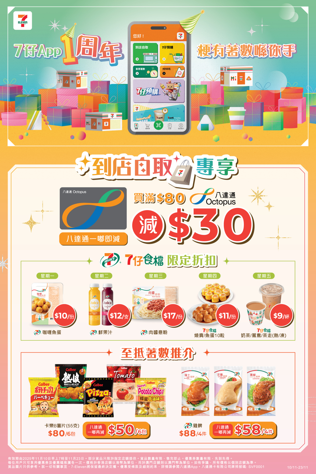 【點新聞報道】為慶祝「7-Eleven 流動應用程式」應用程式登場1周年,7-Eleven由11月10日起推出5大激抵優惠,當中包括八達通限時優惠:由11月10日早上7時起至12月2日期間,於7-Eleven App使用「到店自取」功能買滿$80,輸入優惠碼「OCTOPUSEC」,並以八達通付款即可享有扣減$30優惠,讓你買到盡慳到盡,梗有着數喺你手!接下來一個月多重優惠大放送,萬勿錯過!