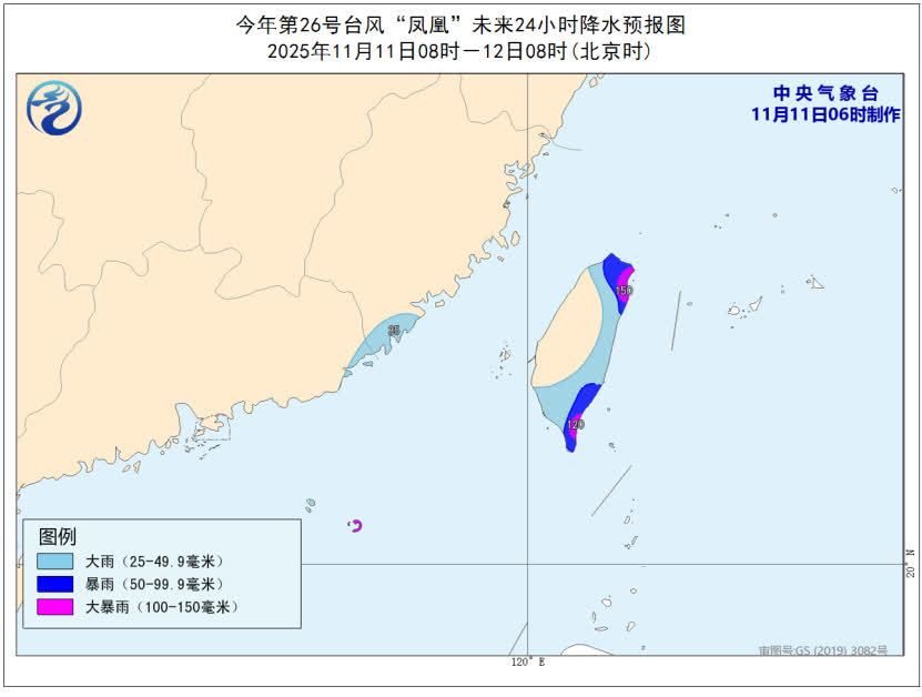 降水預報:11日8時到12日8時,福建東南部、台灣島東部和南部將有大到暴雨,其中台灣島東北部和東南部地區有大暴雨(100—150毫米)。