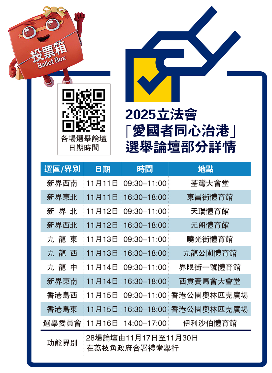 第8屆立法會選舉將於12月7日投票。候選人資格審查委員會昨日公布,已完成審查161名候選人的提名,全部候選人提名有效。接下來,特區政府將舉辦2025立法會「愛國者同心治港」選舉論壇。面向選舉委員會界別、10個地方選區及28個功能界別的全部39場選舉論壇從今日起到本月30日每日舉行。今日舉辦的是新界西南地方選區和新界東北地方選區兩場論壇。
