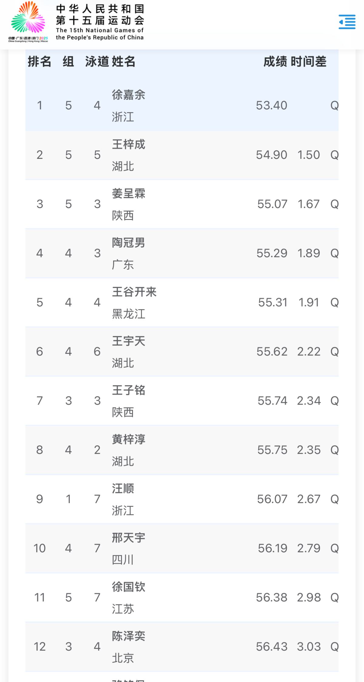 【點新聞報道】11月11日上午,全運會男子100米仰泳預賽,亞洲紀錄保持者徐嘉余以53秒40總成績排名第一進入半決賽,這也是本屆全運會徐嘉余的首秀亮相,汪順則以56秒07總成績排名第九進入半決賽。