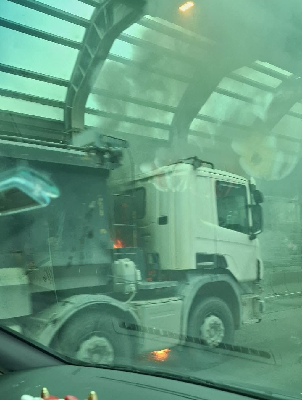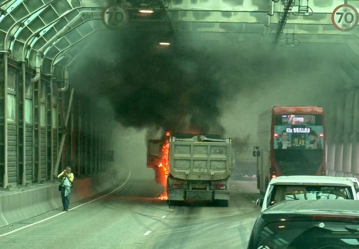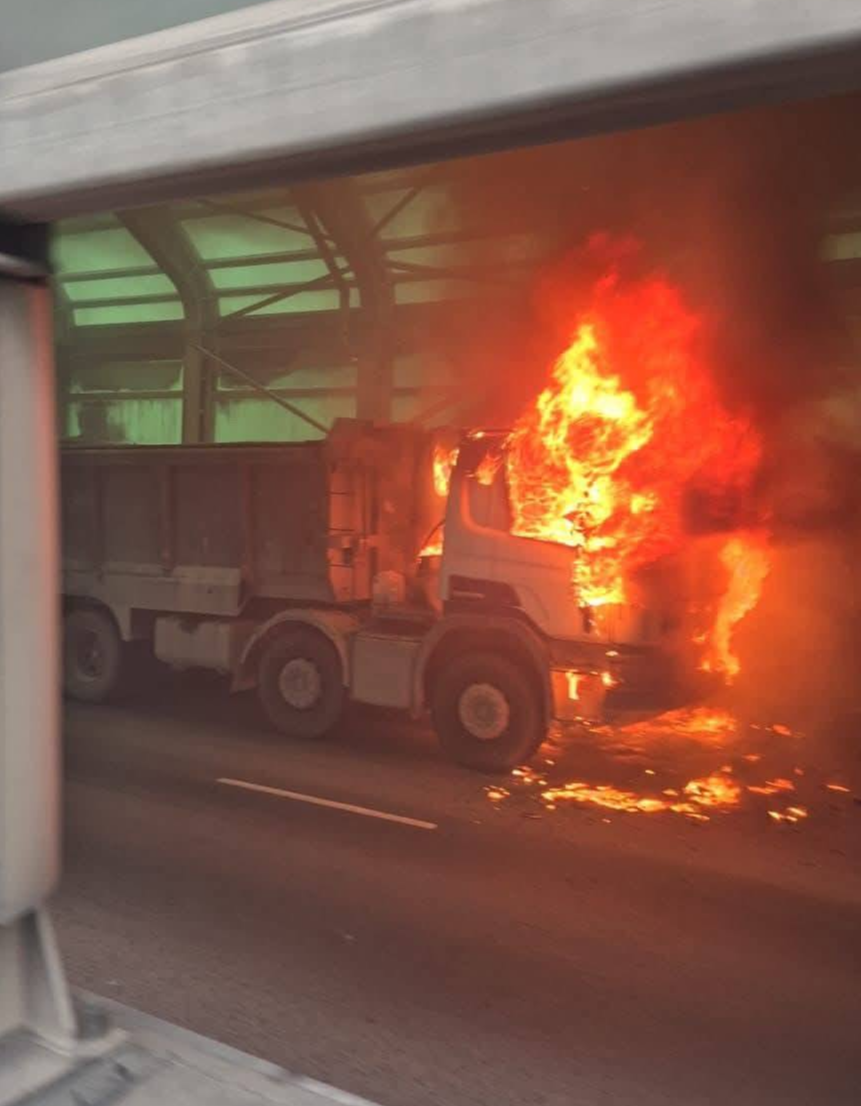 【點新聞報道】今日(11日)上午9時許,一輛泥頭車在屯門公路往九龍方向近青田交匯處起火。由網上視頻可見,泥頭車車頭陷入火海,冒出大量濃煙。消防接報到場開喉,迅速將火撲熄,幸事件中無人受傷,起火原因有待調查。