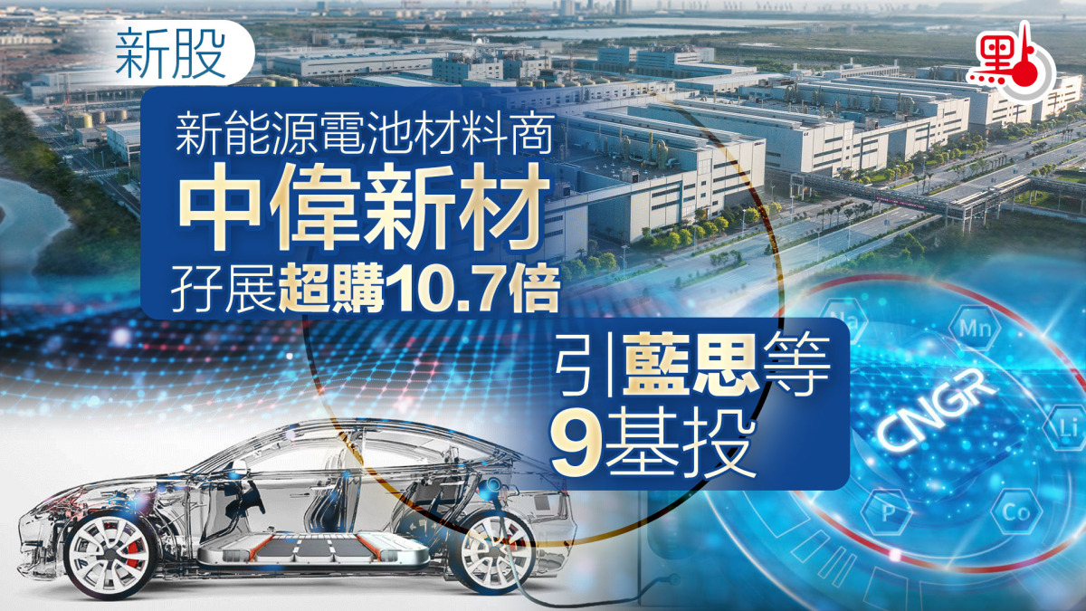 【點新聞報道】特斯拉(TSLA.US)、寧德時代(03750)的電池原料供應商中偉新材料股份(02579.HK)(300919.SZ)於11月7日起至12日招股。中偉新材計劃發行1億股H股,招股價介乎34元至37.8元,集資最多39.4億元。截至今日(11日)上午11時多,中偉新材孖展約42.16億元,以公開發售集資額3.94億元計,超額認購10.7倍。