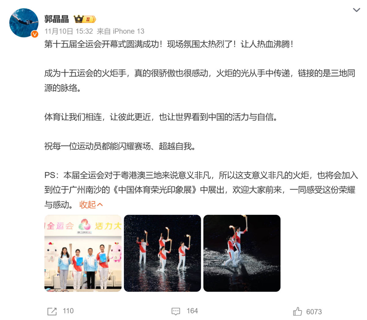 11月10日,郭晶晶於社交媒體發文表示,「第十五屆全運會開幕式圓滿成功!現場氛圍太熱烈了!讓人熱血沸騰!」她更提及,成為十五運會的火炬手「真的很驕傲也很感動」,火炬的光從手中傳遞,鏈接的是三地同源的脈絡。「體育讓我們相連,讓彼此更近,也讓世界看到中國的活力與自信。祝每一位運動員都能閃耀賽場、超越自我。」
