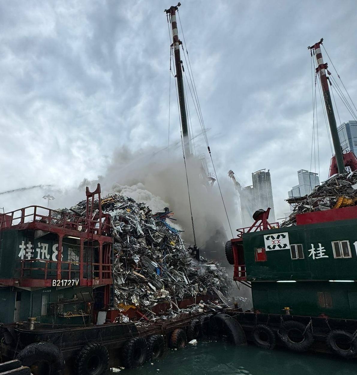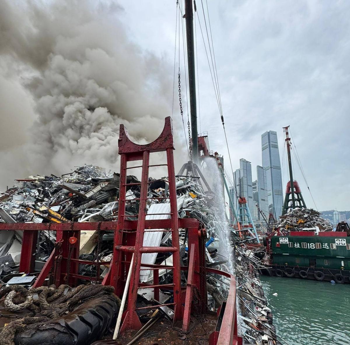 【點新聞報道】今日(11日)下午12時51分,新油麻地避風塘一艘載有金屬廢料的貨船起火,並傳出爆炸聲,濃煙席捲半空,多人報警。消防出動一喉一煙帽隊灌救,初步沒有受傷報告。