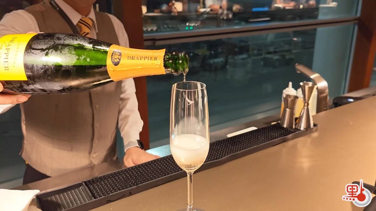 一走進空間,傳統的櫻桃木與框景屏風勾勒出中式美學線條,而開放的酒吧與現代梳化則展現國際化視野。特別引人注目的是那個既能觀看跑道起降、又能品嘗香檳的位置,一邊是香港活力的脈動,一邊是國際視野的從容,這種動靜平衡恰是香港美學的完美呈現。