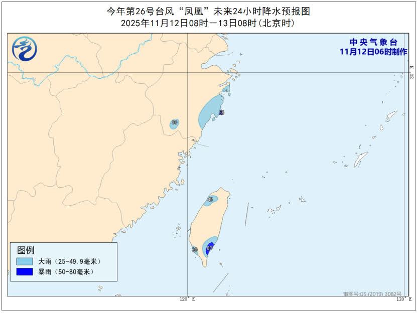 降水預報:12日8時到13日8時,浙江東部、台灣島北部和南部將有大到暴雨(50—80毫米)。