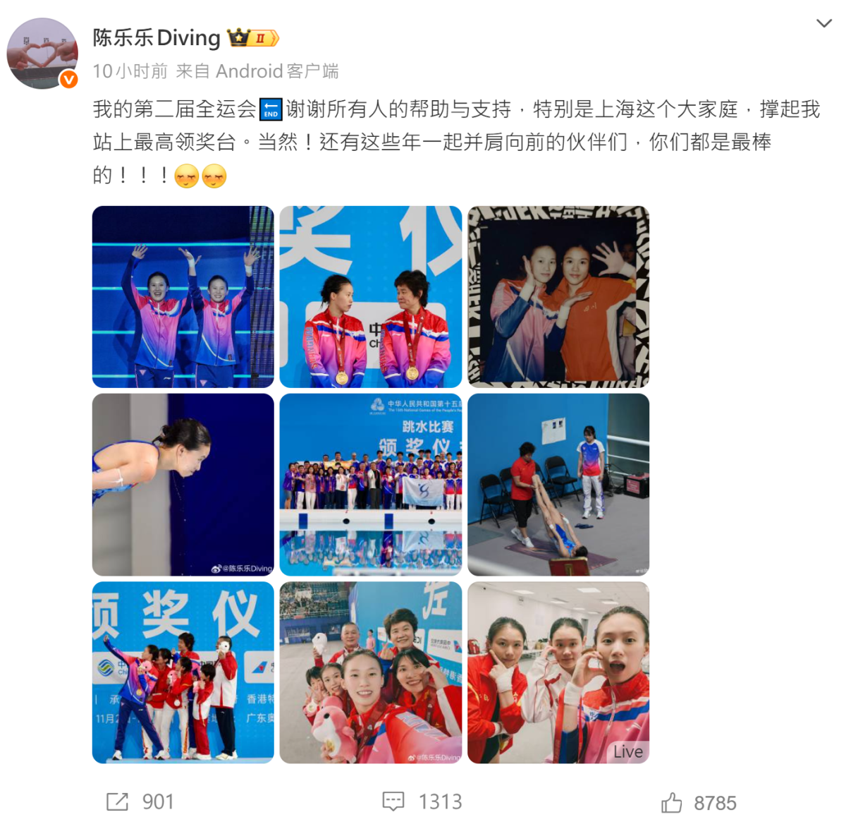 陳芋汐奪兩金後發文總結全運會,指「我的第二屆全運會,謝謝所有人的幫助與支持,特別是上海這個大家庭,撐起我站上最高領獎台。當然!還有這些年一起並肩向前的夥伴們,你們都是最棒的!!!」