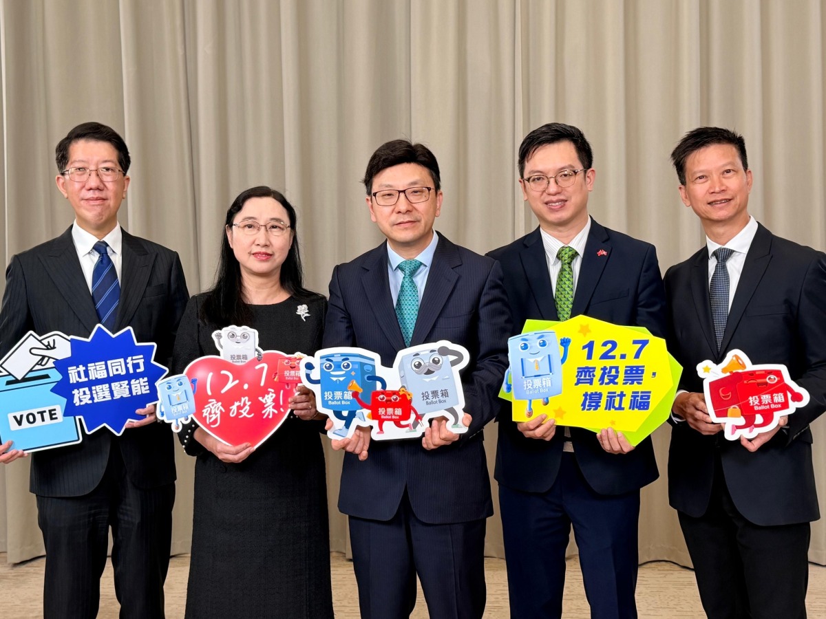 【點新聞報道】立法會換屆選舉投票將於12月7日舉行,勞工及福利局局長孫玉菡率領勞福局常秘劉焱、副局長何啟明、社署署長杜永恒及勞工處處長許澤森,一同以捲紙藝術製作選舉吉祥物「票箱寶寶」,呼籲市民履行公民責任,積極投票,共建美好香港。