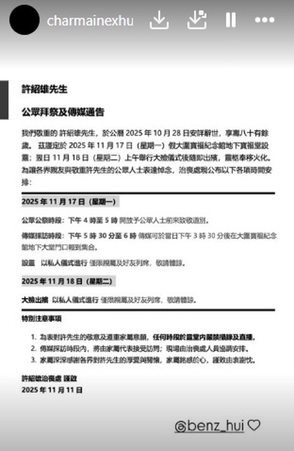 許惠菁發表通知:「我們敬重的許紹雄先生,於公曆2025年10月28日安詳辭世,享壽八十有餘歲」並宣布17日假香港大圍寶福紀念館舉行告別式,當日下午4點至5點開放公眾前往悼念,其餘儀式僅限親屬、好友參與。同時家屬強調,為表達對許紹雄嘅敬意及尊重家屬意願,任何時段於靈堂內皆禁止攝錄、直播,媒體採訪則由家屬代表接受訪問。最後許惠菁感謝大家對許紹雄的關心:「家屬深深感謝各界對許先生的厚愛與關懷,家屬銘感於心,謹致由衷謝忱」