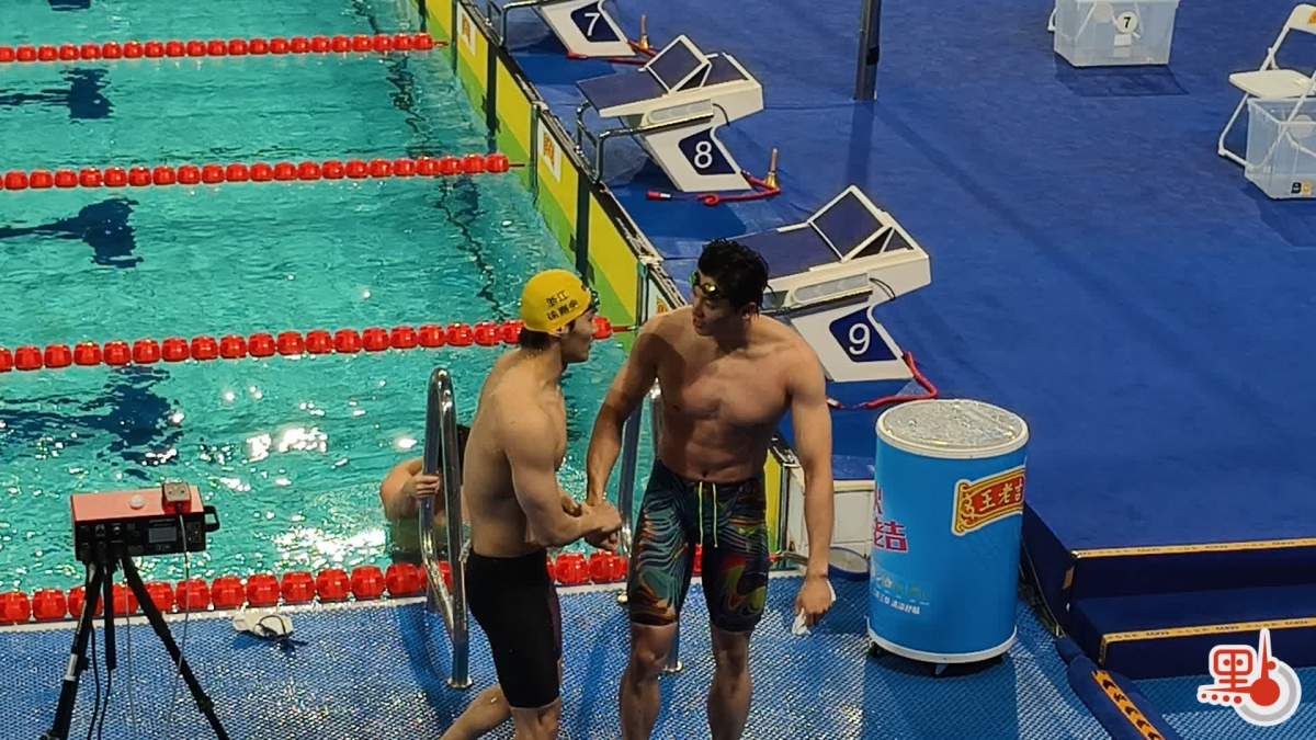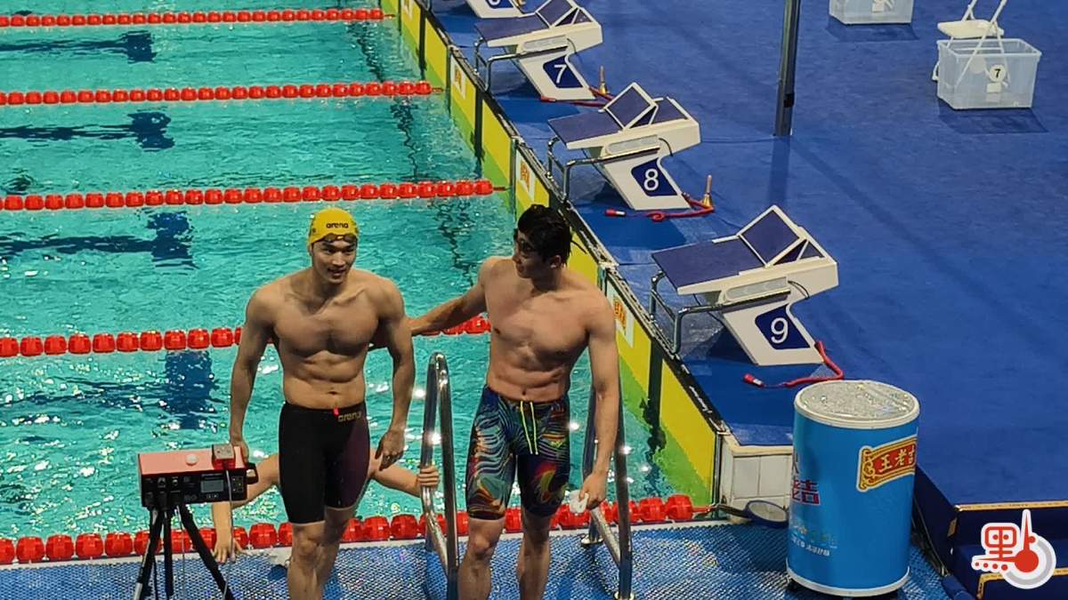 先上岸的汪順等待後來的徐嘉余,擁抱表示祝賀,並牽手向觀眾致意表示感謝,兩人在全場觀眾面前展示了可貴的友情。
