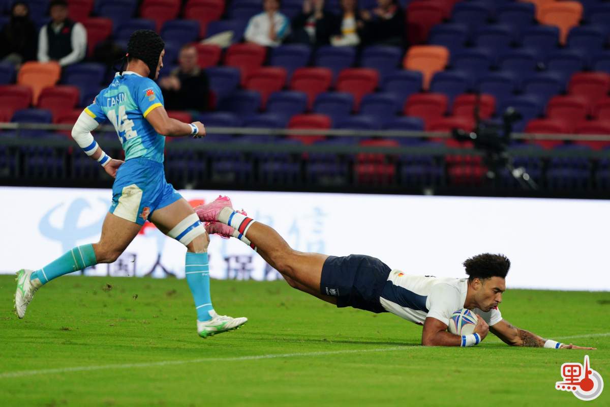 隨着場內一聲令下,上半場的激烈交鋒一觸即發。開場兩分鐘,香港隊8號球員丹馬克持球突破重圍,成功達陣得分,隨後9號球員拜恩菲立斯追加射門,讓香港隊先得7分。緊接着丹馬克和拜恩菲立斯配合再得7分,逐漸拉大比分差距。上半場結束,香港隊以24∶0大幅度領先天津隊。