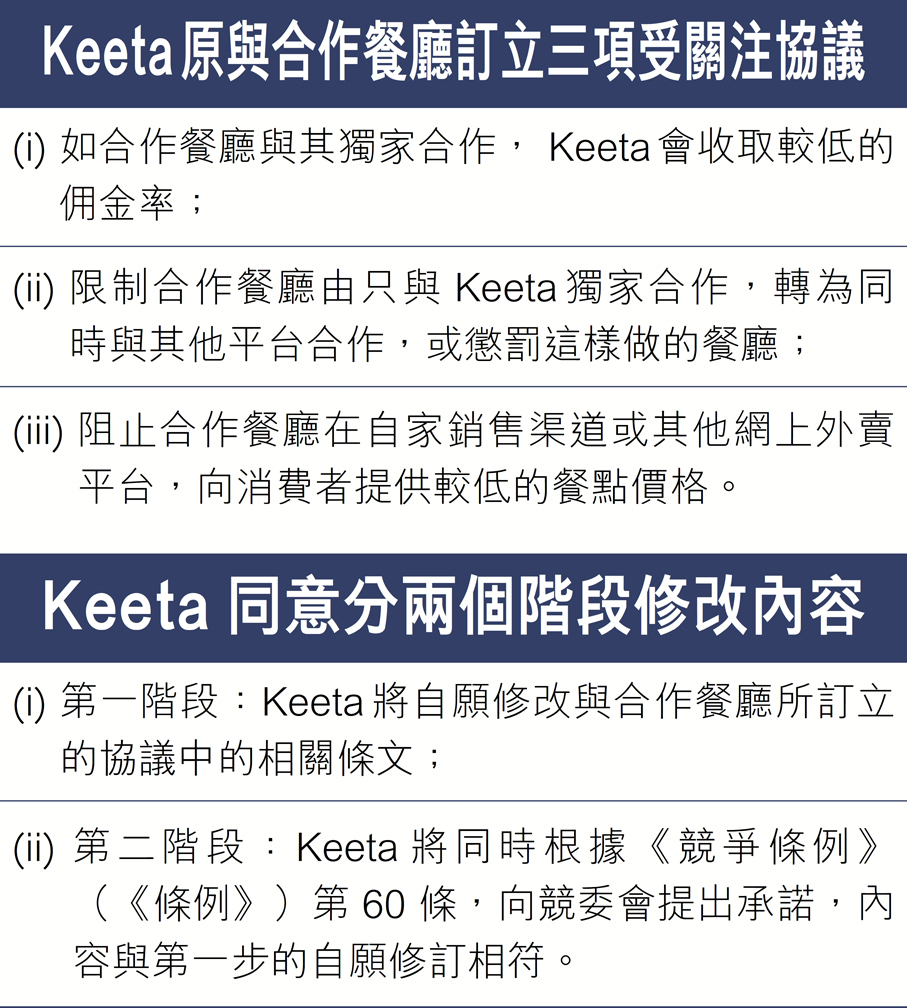 在競委會對此條款表達關注後,Keeta同意分兩個階段修改與合作餐廳的協議,首階段Keeta將自願修改與合作餐廳所訂立的協議中的相關條文;次階段Keeta將同時根據《競爭條例》(《條例》)第60條,向競委會提出承諾,內容與第一步的自願修訂相符。