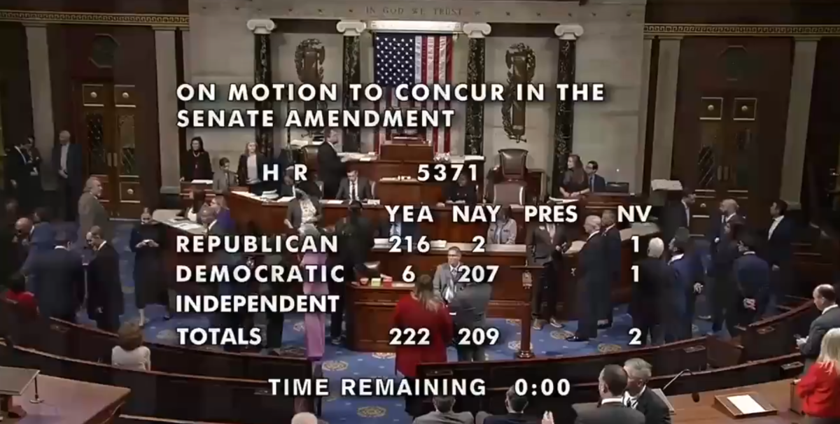 當天,眾議院最終以222票支持、209票反對的結果通過該法案。該法案將為聯邦政府提供持續撥款,使大部分政府機構獲得運作資金直至2026年1月30日。