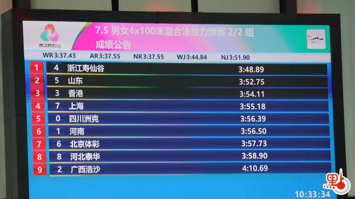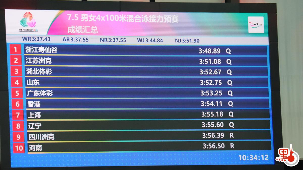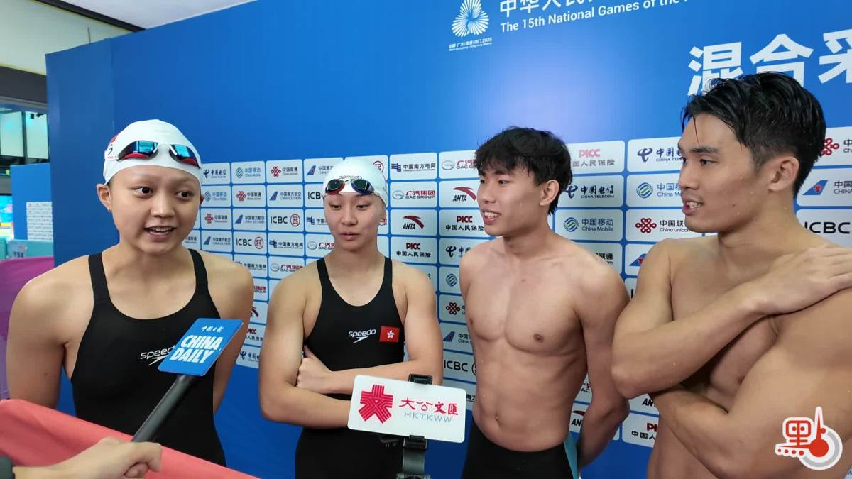 【點新聞報道】11月13日在深圳大運游泳館舉行了男女4x100米混合泳接力預賽。張心悅(仰泳)、張智傑(蛙泳)、古逸豪(蝶泳)、李芯瑤(自由泳)四人組成的香港隊在第二組出戰,遇上強隊浙江隊與山東隊,以3分54秒11的成績拿下小組第三,預賽總排名第六,晉級到今晚的決賽。