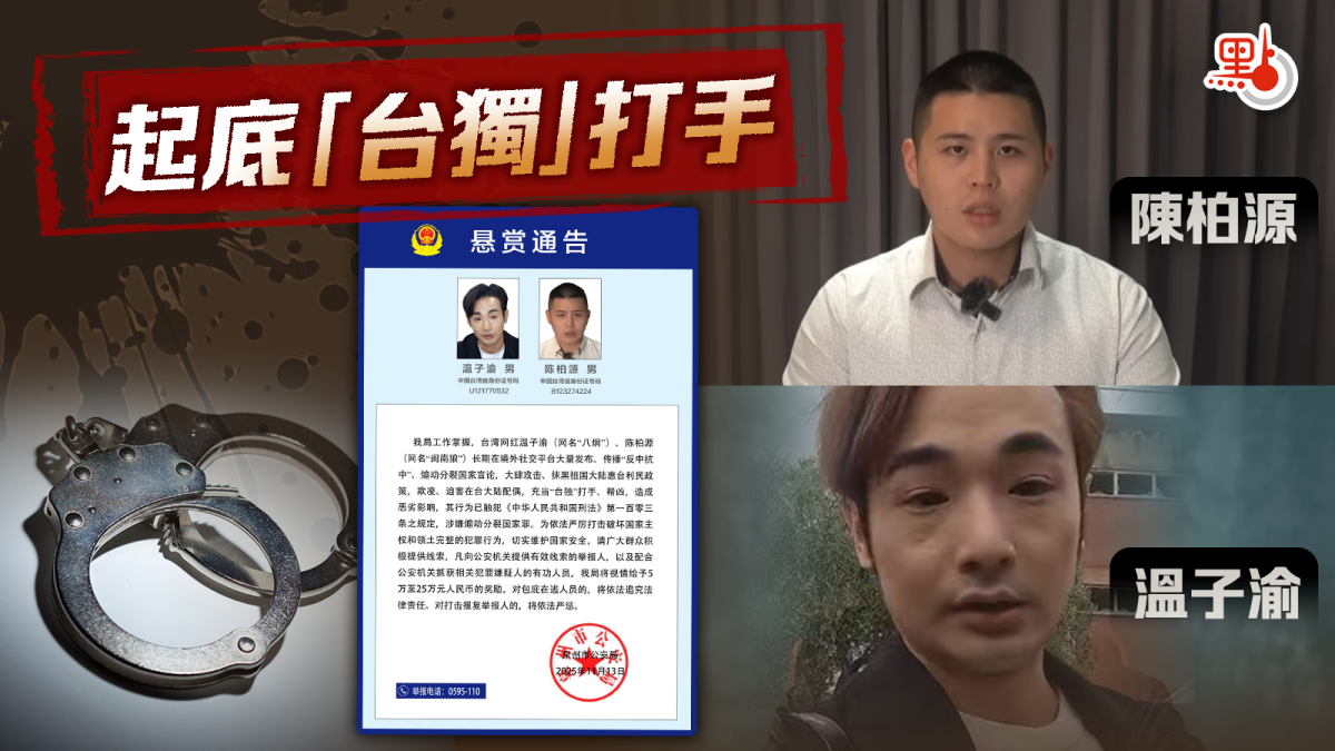 11月13日,國務院台辦發言人陳斌華表示,台灣網紅溫子渝(網名「八炯」)、陳柏源(網名「閩南狼」)長期發布、傳播「抗中保台」、「倚美謀獨」等煽動分裂國家言論,大肆攻擊、抹黑大陸惠台利民政策,欺凌、迫害在台大陸配偶和支持兩岸關係和平發展的台灣同胞,充當「台獨」打手幫兇,助紂為虐、影響惡劣。公安機關發布通告懸賞徵集其違法犯罪線索,是依法懲治分裂國家、煽動分裂國家犯罪的具體行動,是回應兩岸民眾懲「獨」呼聲的正義之舉,正當必要。