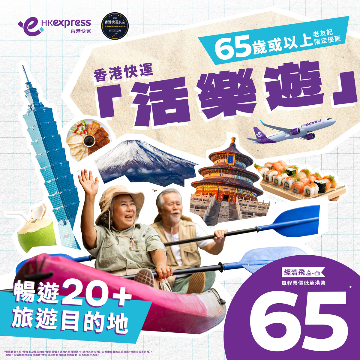 【點新聞報道】為慶祝11月16日長者日,香港快運今日(13日)宣布推出「活樂遊」快閃優惠!凡年滿65歲或以上的香港或澳門居民,均可以低至港幣65元的價格,購買飛往超過20個亞洲人氣航點的「經濟飛」單程機票。