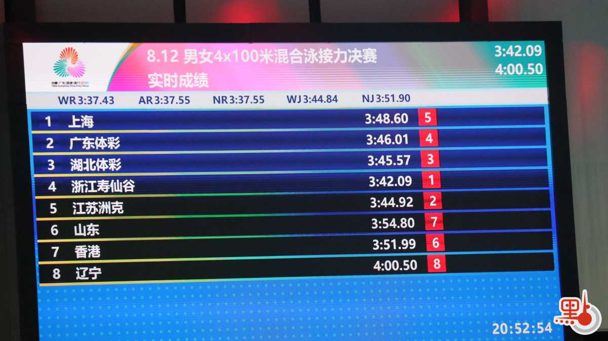 【點新聞報道】今晚(13日)舉行的全運會男女4×100米混合泳接力決賽中,港隊以3分51秒99的成績獲得第六名。