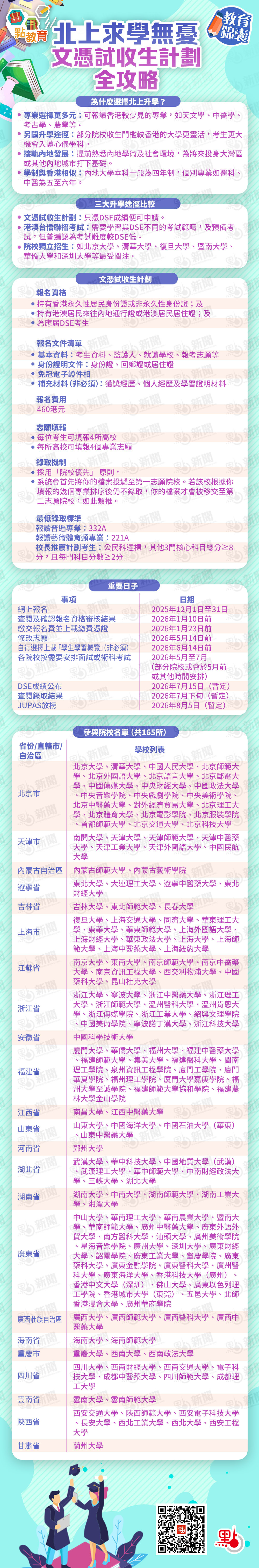 【點新聞報道】DSE畢業,不止一條出路!近年,無論是想報讀香港稀少的專業,還是為未來在內地發展鋪路,北上求學已成為香港學生的熱門選擇。其中,內地高校招收香港中學文憑考試學生計劃(簡稱「文憑試收生計劃」)為主要申請方式之一。2026/27年度,該計劃內的高等院校數目增加至165所。點教育現為你整合所有關鍵資訊,助你規劃升學無難度。