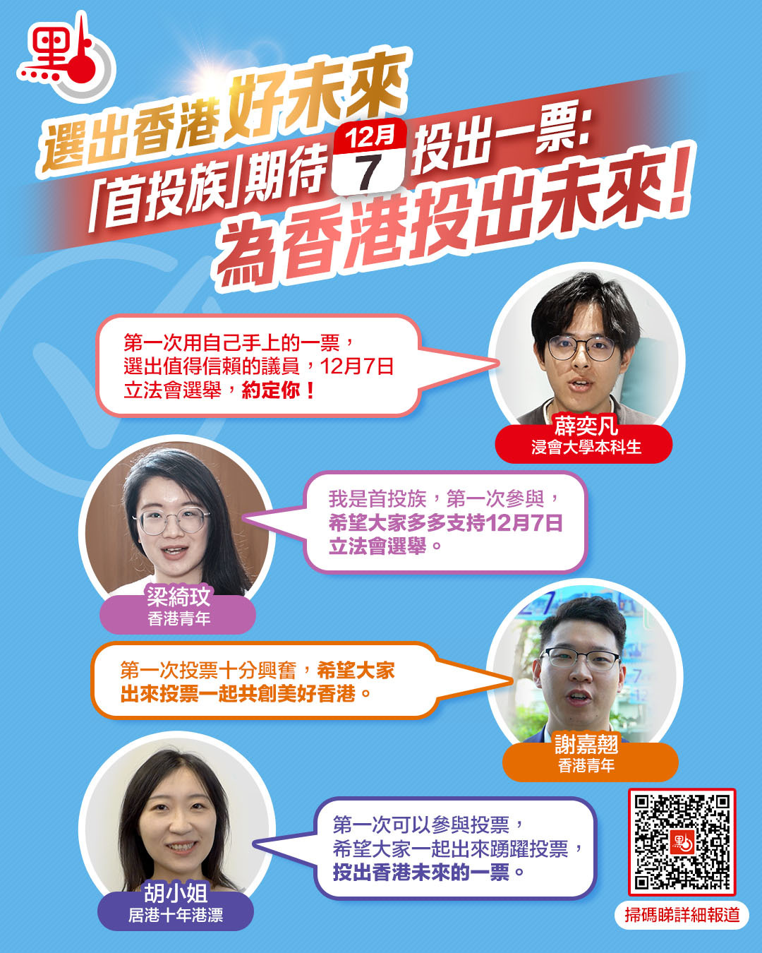 「我是首投族,第一次參與立法會選舉投票工作,希望大家多多支持12月7日立法會選舉。」剛剛從浸會大學畢業的港青梁綺玟Carmen,讚今屆政府和立法會十分重視青年發展,「比如住屋不夠,就推出青年宿舍,我們需要實習或交流機會,就推出各類實習計劃。我覺得這方面做得很好」。Carmen認為,參與投票是行使公民權利和責任,只有親身參與才知道社會在經歷什麼。