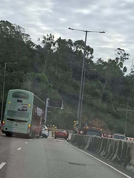 網上圖片可見,涉事白色私家車車頭凹陷損毀,零件脫落。往觀塘方向現車龍,交通嚴重擠塞。