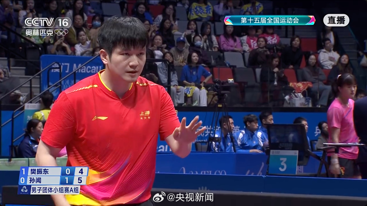 上海隊第一個出場的單打選手樊振東再次上演面對困難逆風翻盤的表現。在與孫聞的對抗中,他屢次落後屢次趕超,最終以總比分3-1贏下比賽,四局比分分別為:8-11、13-11、14-12、11-6。