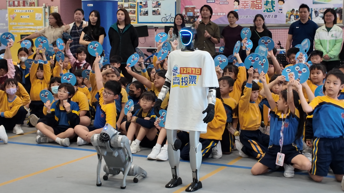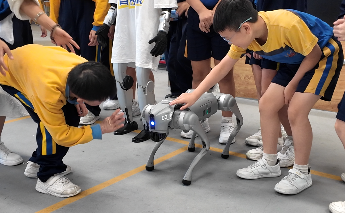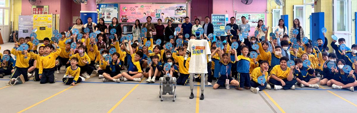 活動中,身穿「12月7日齊投票」宣傳服的宇樹科技機器人及機器狗成為全場焦點,為同學帶來一場別開生面的科技表演。這些智能夥伴憑藉精準動作與靈活姿態,贏得在場師生的陣陣驚嘆與掌聲。表演結束後,機器人及機器狗更與學生們進行了近距離的親切互動及大合照,讓同學們在歡樂的氣氛中,親身感受科技的魅力以及認識到12月7日立法會選舉的重要性。