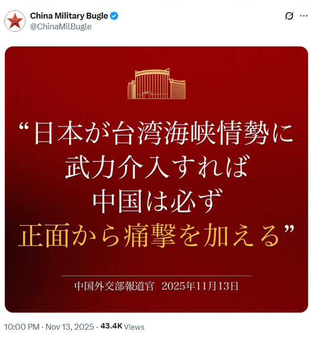 【點新聞報道】11月13日,中國軍號在社交平台X上發布日語海報:「如日方膽敢武力介入台海局勢,中方必將迎頭痛擊!」同時亦有發布同款英文海報。