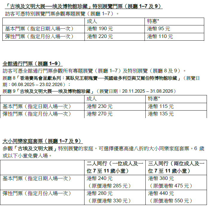 作為香港歷來規模最大、內容最豐富、展期最長的古埃及文物展,「古埃及文明大展」展出由埃及最高文物委員會借出的250件珍貴文物,涵蓋巨型雕像、石碑、木乃伊棺槨和面具、首飾、日用品,以及動物木乃伊等。這些展品來自其轄下七間博物館及薩卡拉的最新重大考古發現。