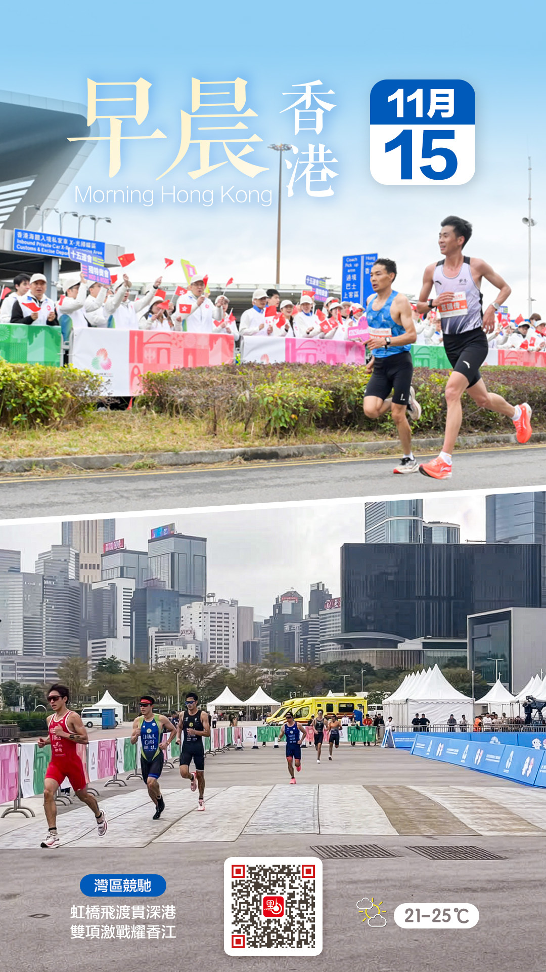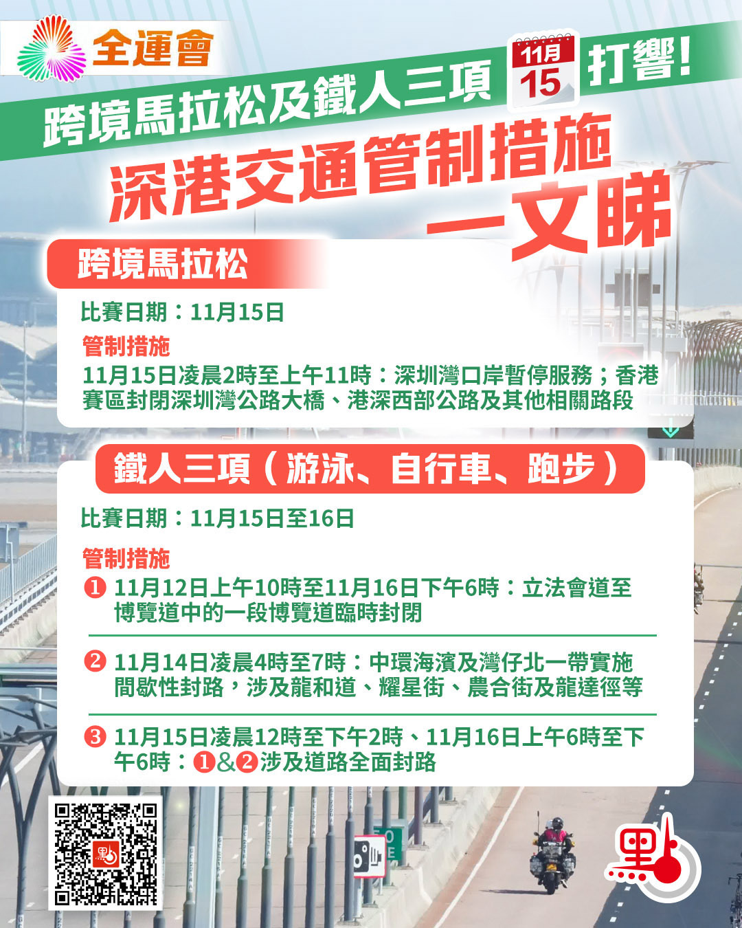 【點新聞報道】第十五屆全國運動會馬拉松比賽今日(11月15日)舉行,鐵人三項項目在今日及明日(11月15日及16日)舉行。為配合比賽,深圳灣口岸通關服務今日有特別安排,包括客運及貨車通關服務;今日及明日,中環及灣仔北一帶(包括博覽道、龍和道、耀星街、龍合街和龍達徑)會實施封路及臨時交通改道,受影響的駕駛者需改經菲林明道、干諾道中、夏慤道或告士打道。(點擊睇交通安排)