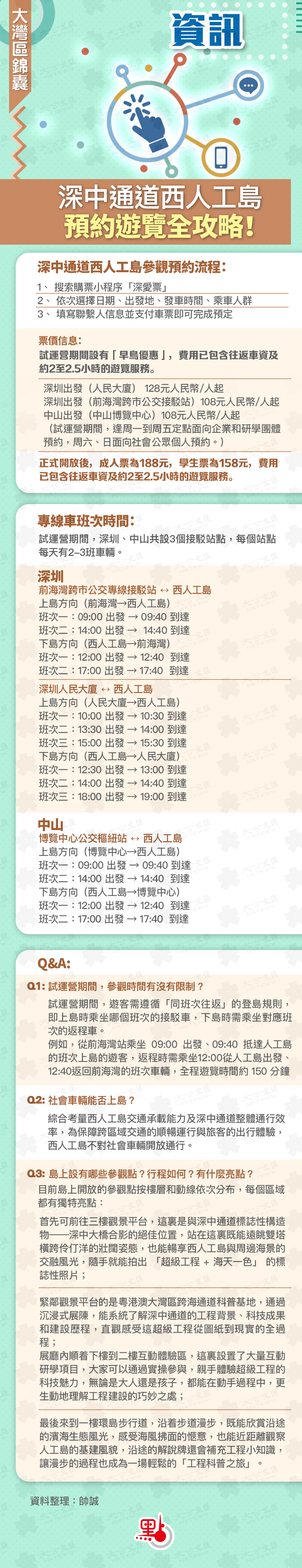 試運營期間,文旅運營單位還將在中山和深圳分別增加出發點和車輛班次,持續完善餐飲、導覽等服務,西人工島預計於今年12月正式對公眾開放。如何預約登島參觀?如何乘車?參觀亮點有什麼?一圖了解!