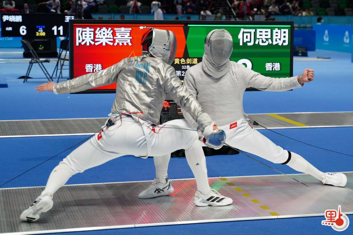 男子佩劍32強則上演「港隊內戰」,由陳樂熹對何思朗,雖然陳樂熹在落後9比13之下於尾段連追3分,但最終仍以12比15的比分不敵何思朗,無緣16強。