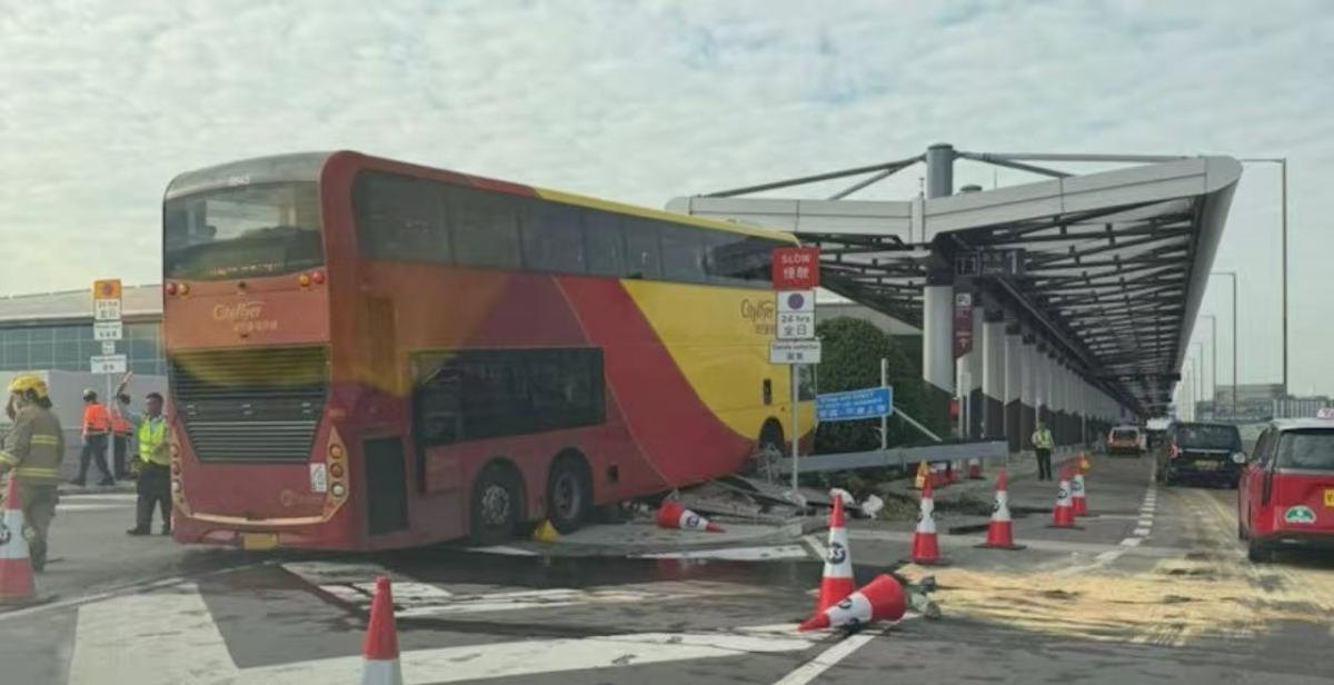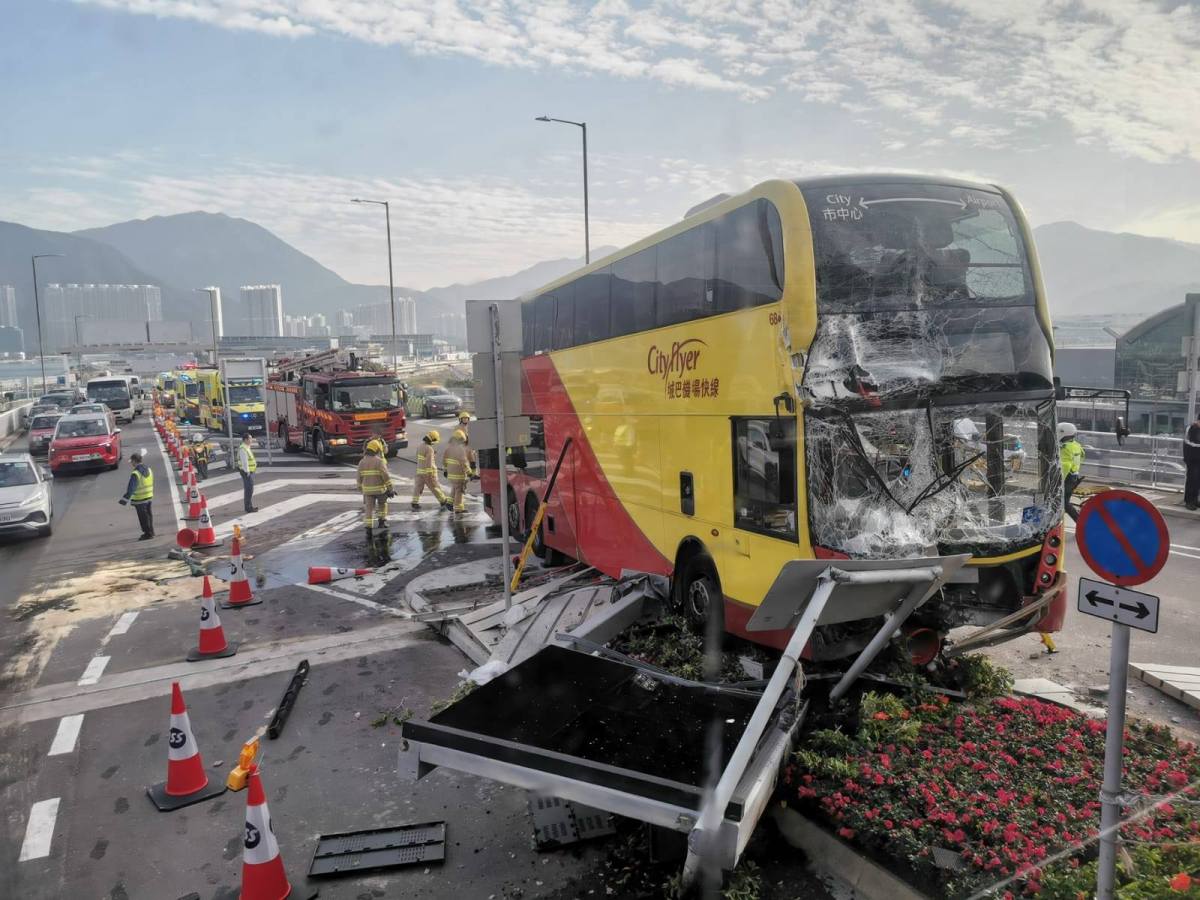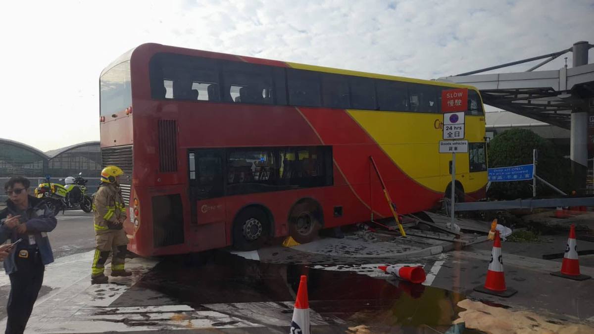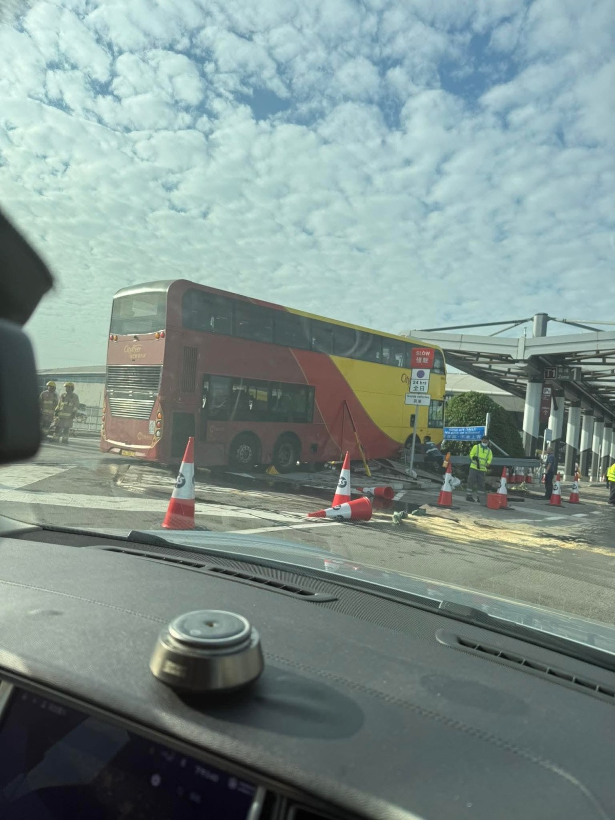 據網上圖片所見,現場位置為一號客運大樓巴士落客區附近。涉事城巴擋風玻璃碎裂,車頭擱在石壆上,最前兩邊車胎懸空,雪糕筒四散,碎片散落一地。