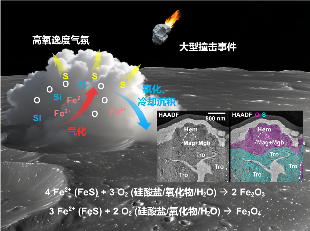 自人類登月以來,月球被認為整體還原,極度缺少氧化作用的關鍵證據,特別是赤鐵礦等高價態鐵氧化物。研究提出,赤鐵礦的形成可能與月球歷史上的大型撞擊事件密切相關。大型撞擊形成瞬時高氧逸度氣相環境的同時,鐵元素在高氧逸度環境中被氧化,使隕硫鐵發生了脫硫反應,經氣相沉積過程形成微米級晶質赤鐵礦顆粒。值得關注的是,該反應的中間產物為具有磁性的磁鐵礦和磁赤鐵礦,可能是南極-艾特肯盆地邊緣磁異常的礦物載體。該研究首次利用樣品證實了在超還原背景下月球表面存在赤鐵礦等強氧化性物質,揭示了月球的氧化還原狀態以及磁異常成因。