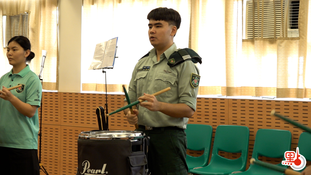 如今的李伯右身上,已全然看不到昔日的青澀、紀律觀念的影子,他身姿筆挺、談吐清晰,甚至在教官忙碌時主動協助記者推進拍攝進度。被問起現時的訓練日常,李伯右介紹自己如今任鼓樂隊隊長,每周五來總會統籌訓練,並告知隊員們表演日程等安排。自2019年成立以來,鼓樂隊已完成超過20場表演。李伯右有時也會負責儀仗隊的任務,例如參加金紫荊廣場的升旗儀式、接待內地高校訪港團等,亦在總會參與人群管理等服務性工作。
