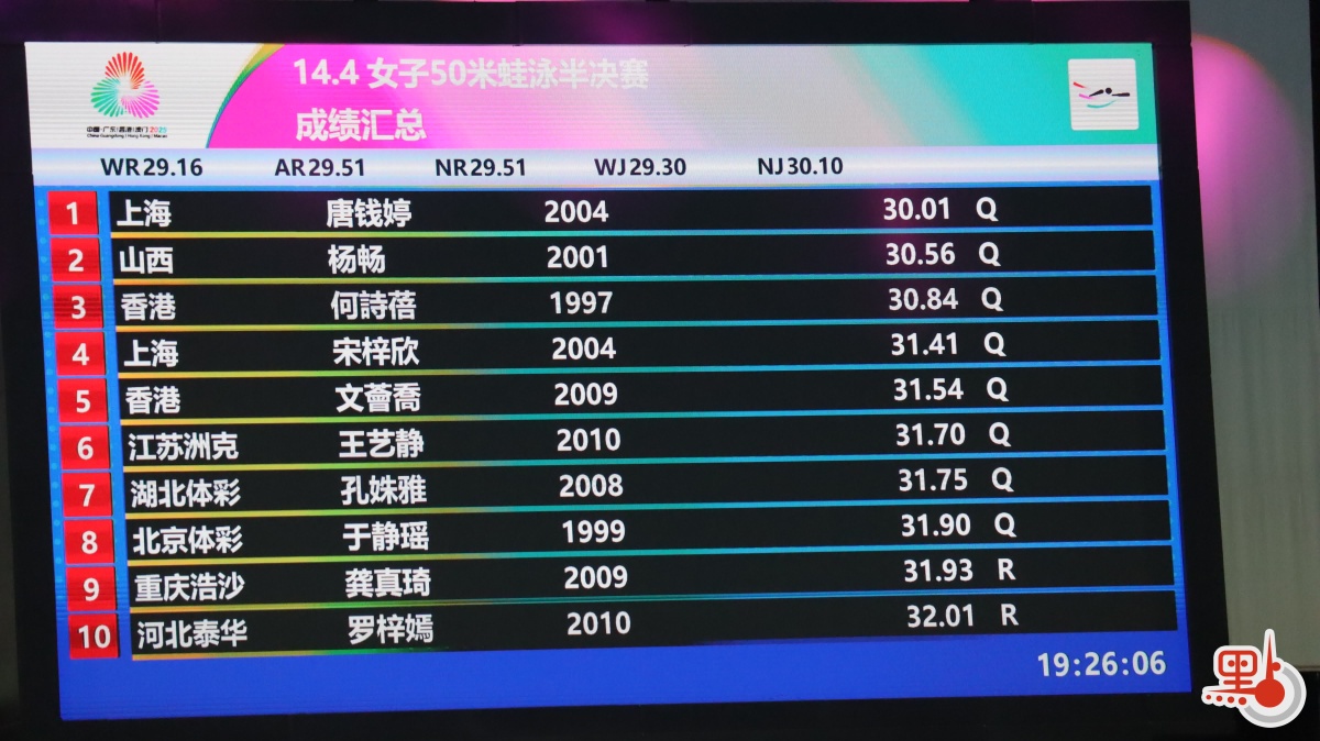 【點新聞報道】11月16日,在第十五屆全運會女子50米蛙泳半決賽中,亞洲紀錄保持者、上海名將唐錢婷以30.01秒的絕對優勢排名第一,展現出衝擊金牌的強勁實力。香港「女飛魚」何詩蓓以30.84秒位列總成績第三,順利晉級;另一位香港選手文薈喬以31.54秒排名第五,同樣獲得決賽席位。