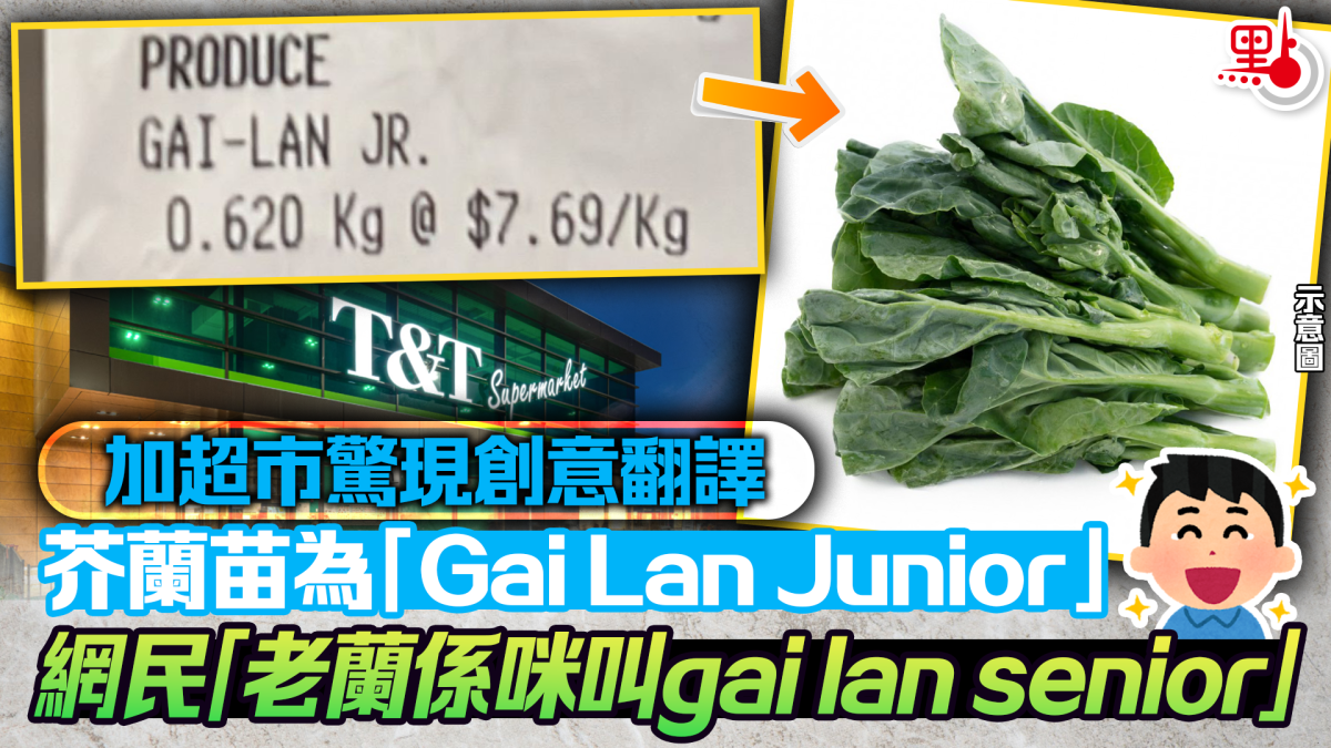 【點新聞報道】近日有網民於社交平台分享超市購物趣事,指在加拿大一間超市見到芥蘭苗的英文名稱被翻譯為「Gai Lan Junior」,引發網上熱議。